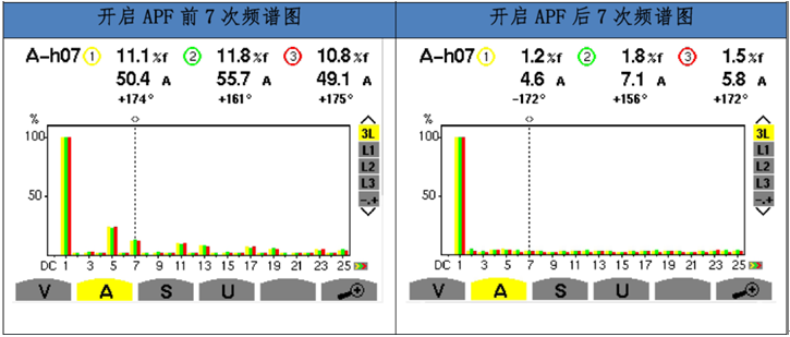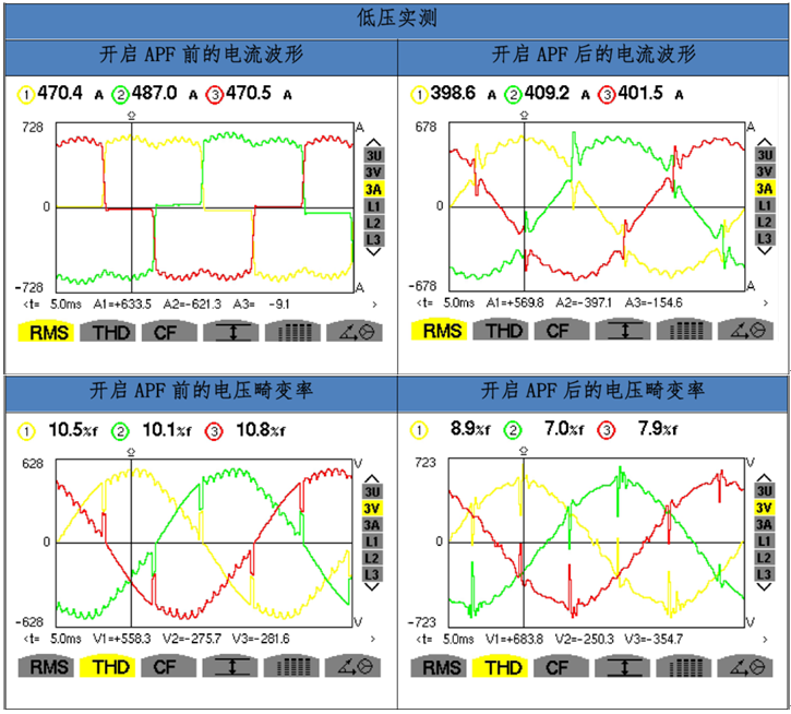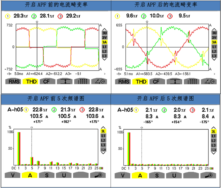 燦能公司在該機(jī)械加工廠(chǎng)10kV/0.4kV配電變壓器低壓側(cè)安裝一套300A有源濾波設(shè)備,為確保有源濾波設(shè)備能夠在惡劣的供電環(huán)境下長(zhǎng)期正常工作,還在每個(gè)有源濾波模塊前端各配置了1個(gè)RC組件。